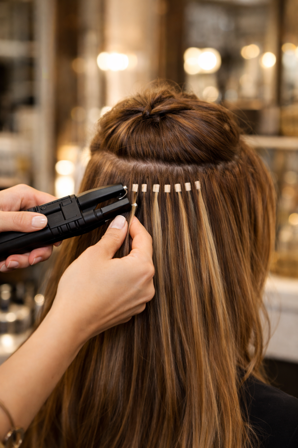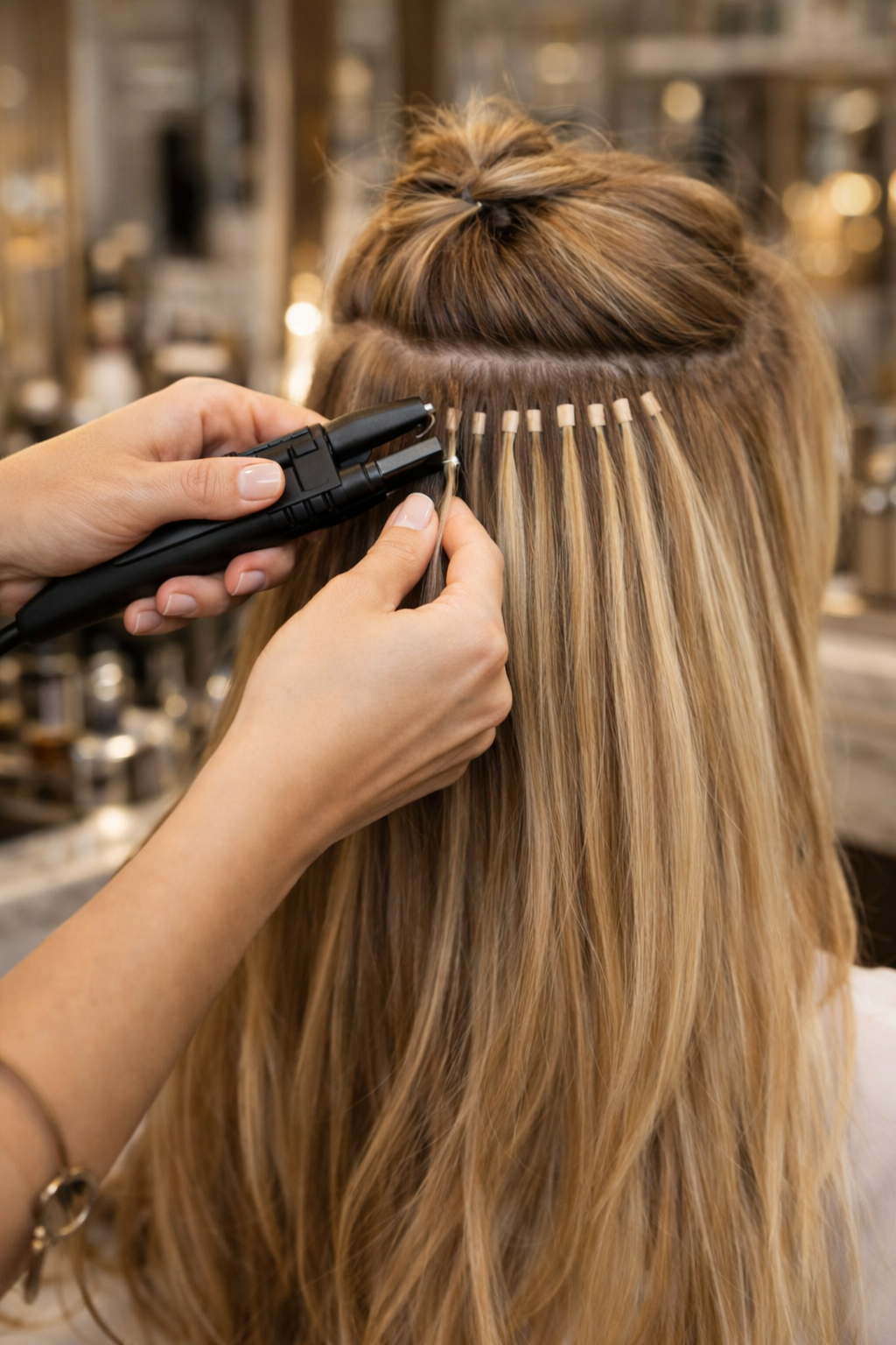 Keratin bond extensions offer a long-lasting result that blends naturally with your hair. When warmed, they soften gently and remain discreet, comfortable, securely.